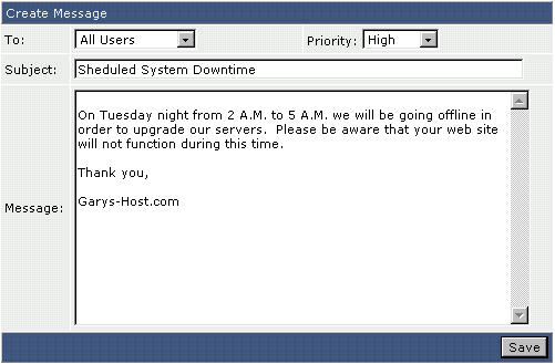 Поле "To:" ("Кому") будет установлено в положении "All Users." ("Всем пользователям") Выберите приоритет сообщения, тему сообщения, и наберите текст самого сообщения. Для рассылки сообщения нажмите кнопку "Save" ("Сохранить").