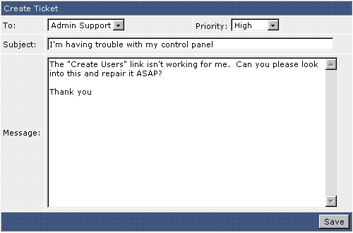 If this Reseller wanted to send a support ticket to the server Admin, he would click the "Create a Ticket" link at the top of the screen. The ticket page would look like this: