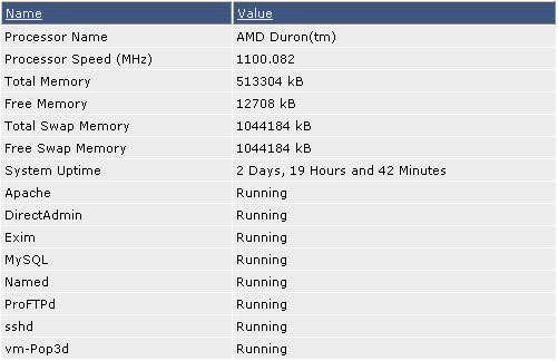 Опция просмотра информации о сервере поможет Вам определить использование памяти сервером, время непрерывной работы, и статус всех процессов системы. По косвенным признакам можно судить о перегрузке сервера (например, отсутствие свободной физической памяти или свапа (swap) сервера может свидетельствовать о чрезмерной нагрузке на сервер).